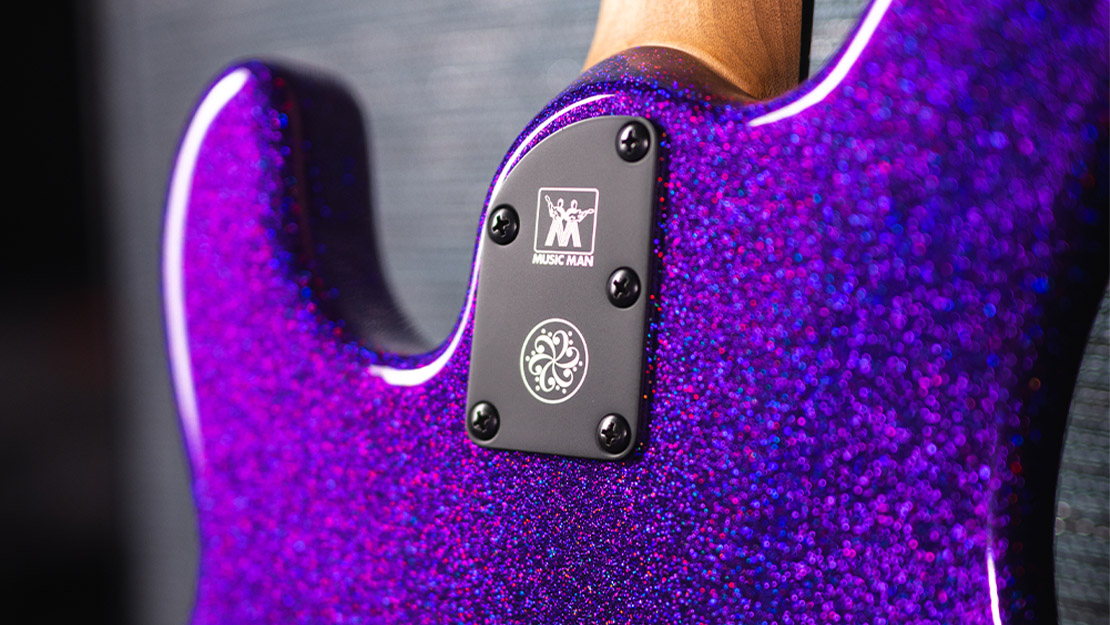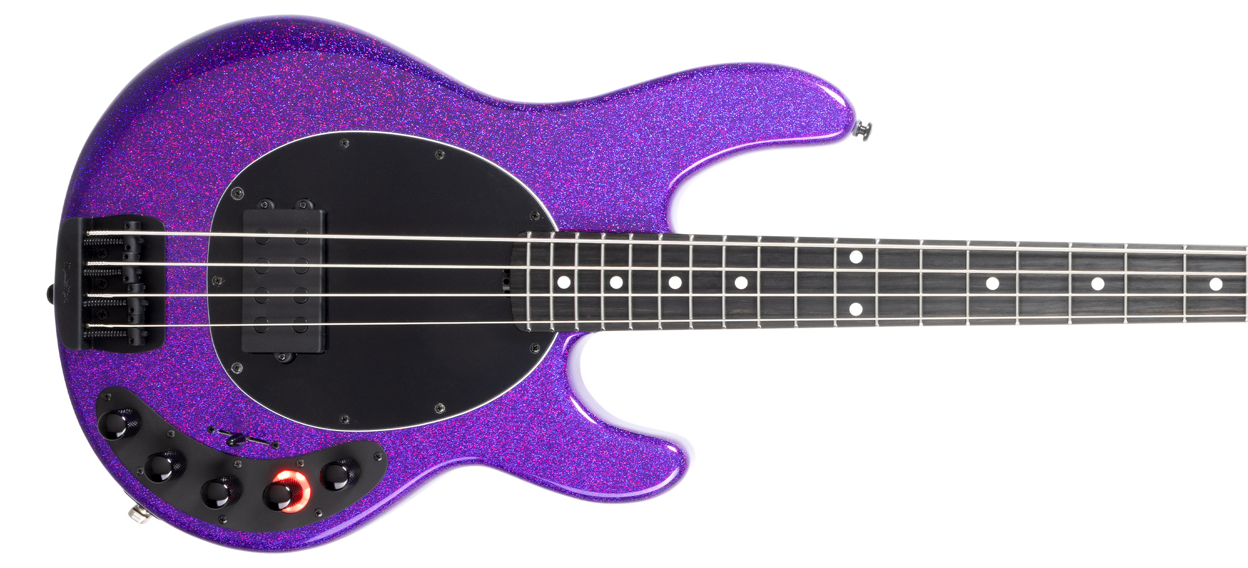 | Brücke | Vintage Music Man® top-loaded, schwarz plattierte Stahlbrücke mit schwarz plattierten Vintage-Stahlsätteln |